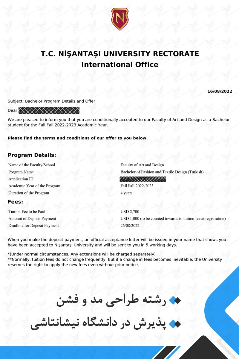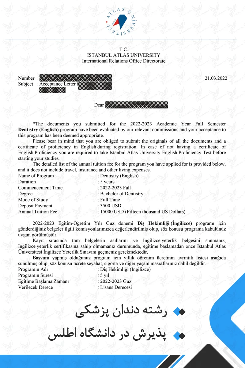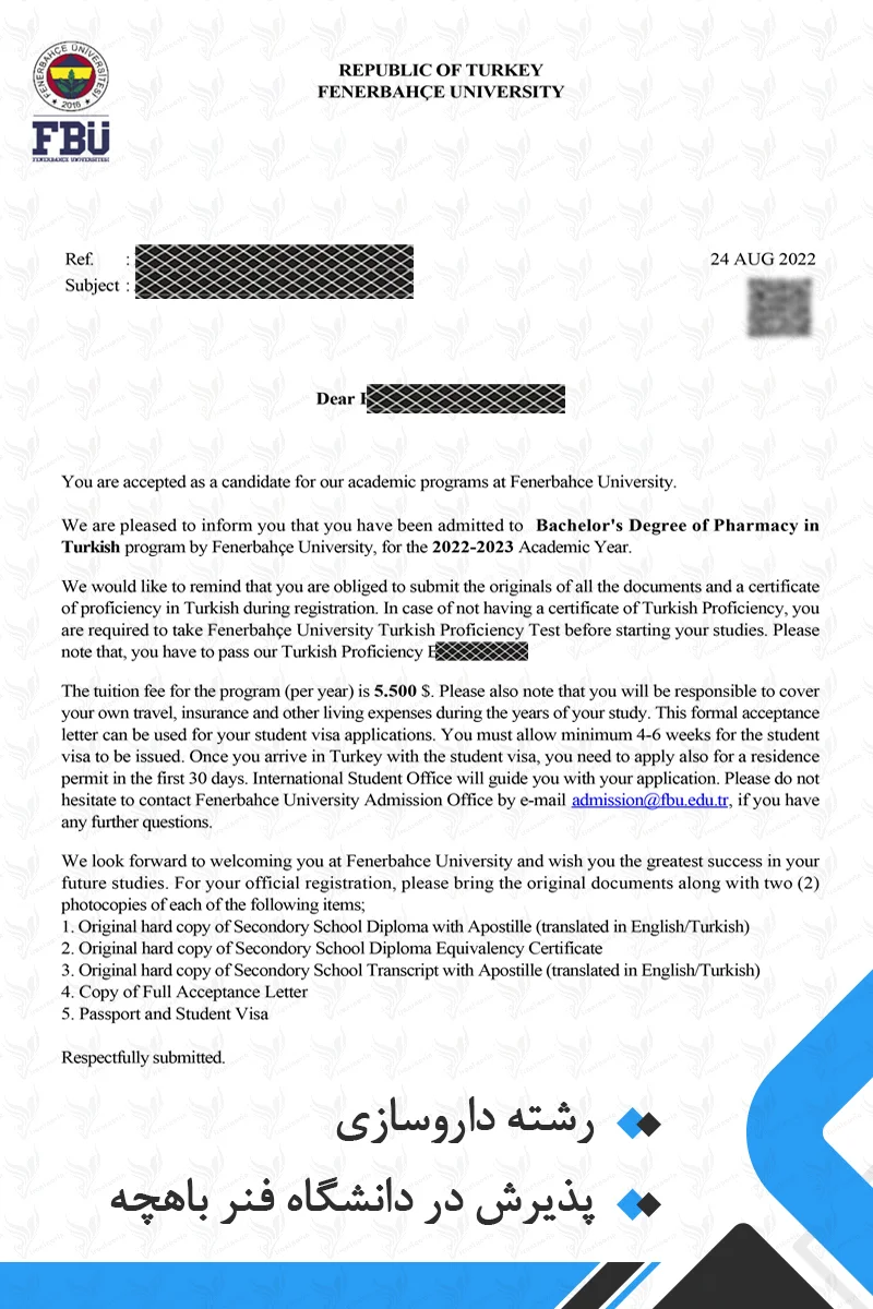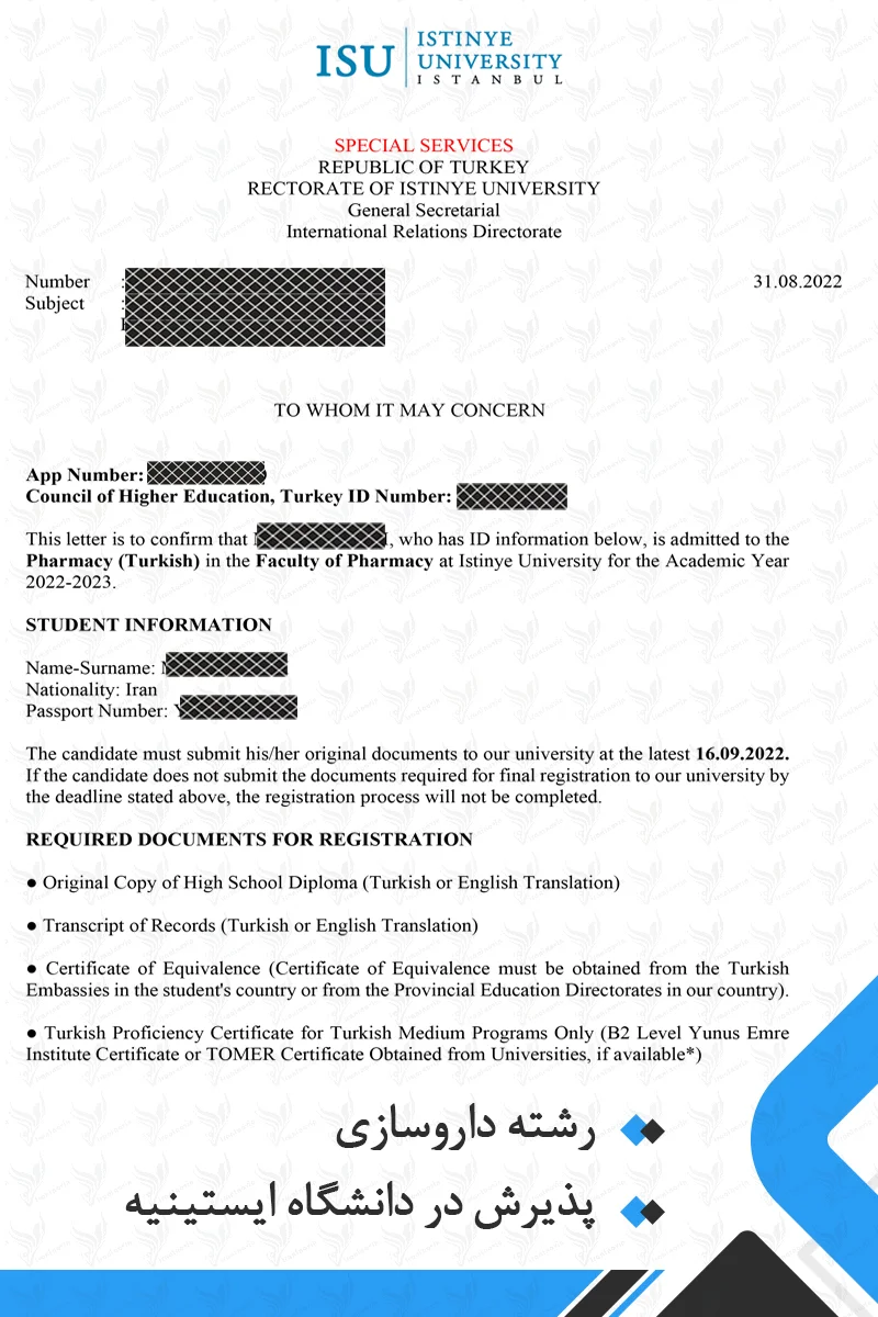 ویزا و اقامت: پس از دریافت نامه پذیرش، باید برای ویزای تحصیلی اقدام کنید و پس از ورود به ترکیه، مجوز اقامت دانشجویی دریافت نمایید.